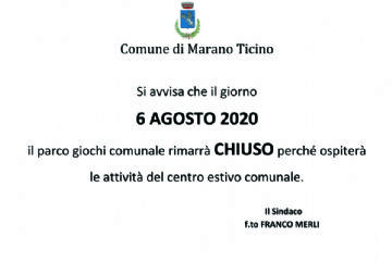 Si avvisa che il giorno 6 AGOSTO 2020 il parco giochi comunale rimarrà CHIUSO perchè ospiterà le attività del centro estivo comunale.