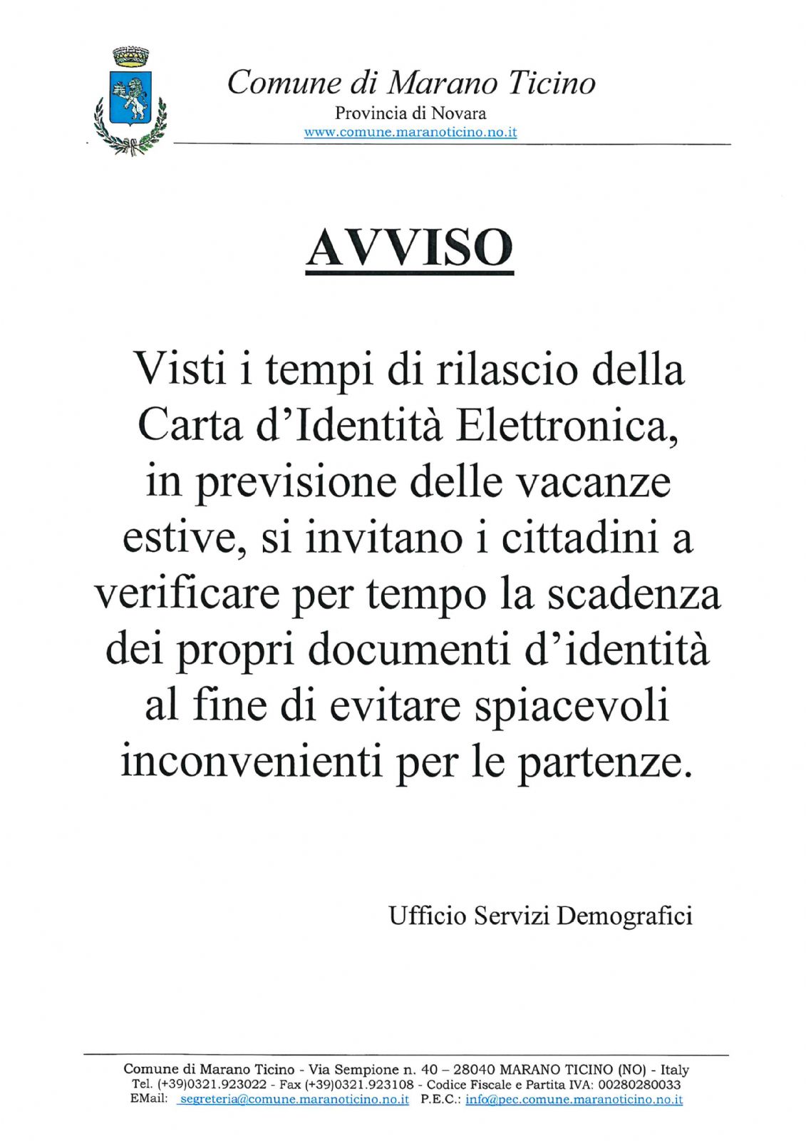 in previsione delle vacanze estive, si invitano i cittadini a verificare per tempo la scadenza dei propri documenti d’identità al fine di evitare spiacevoli inconvenienti per le partenze.