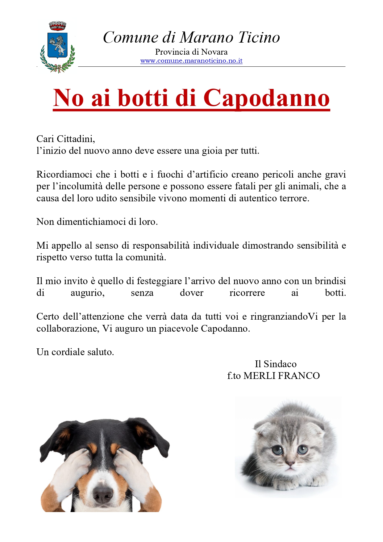 Il mio invito è quello di festeggiare l’arrivo del nuovo anno con un brindisi di augurio, senza dover ricorrere ai botti.