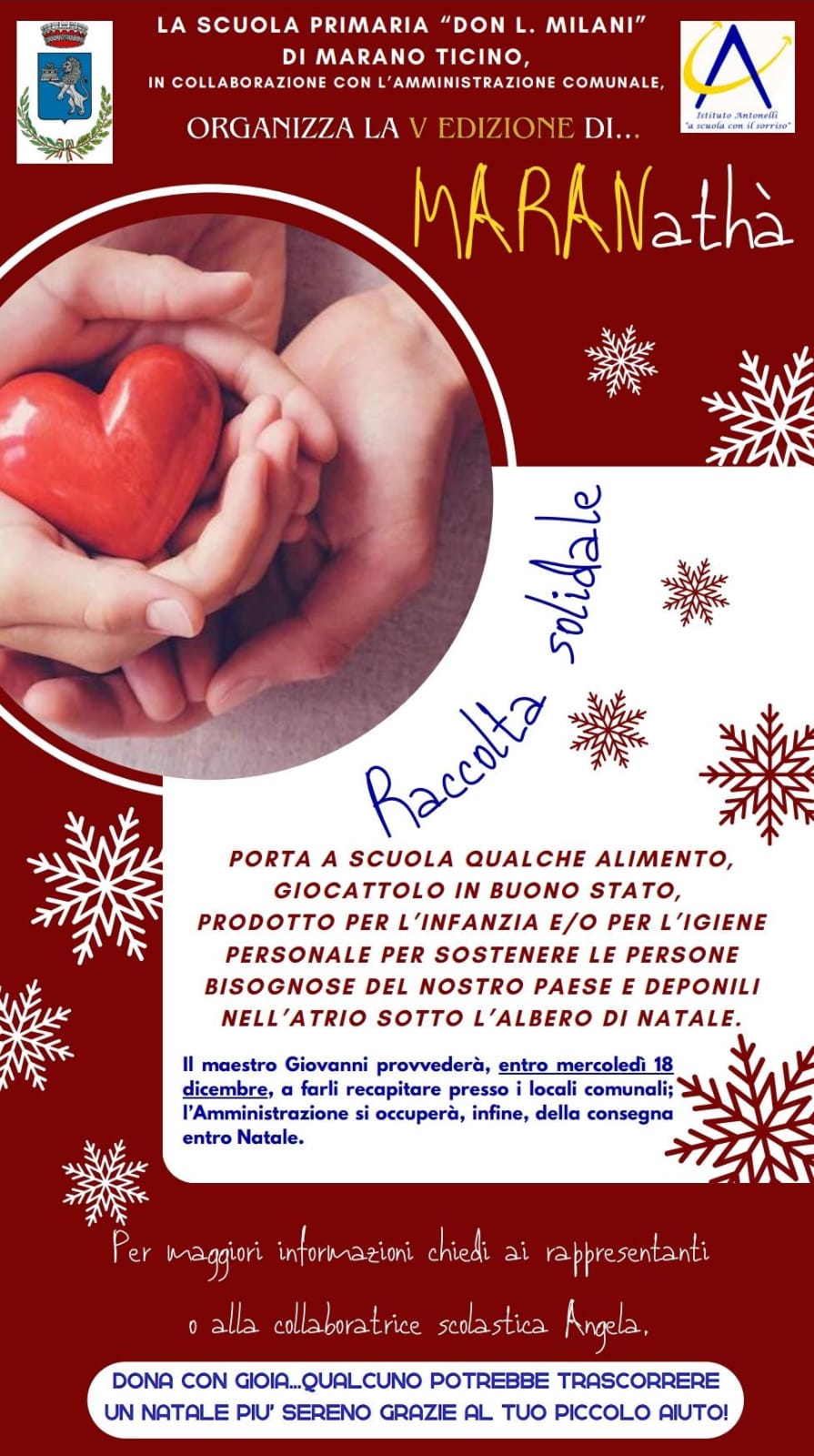 La Scuola Primaria Don Lorenzo Milani di Marano Ticino in collaborazione con l'Amministrazione Comunale organizza la V edizione di MARANathà - Raccolta Solidale.