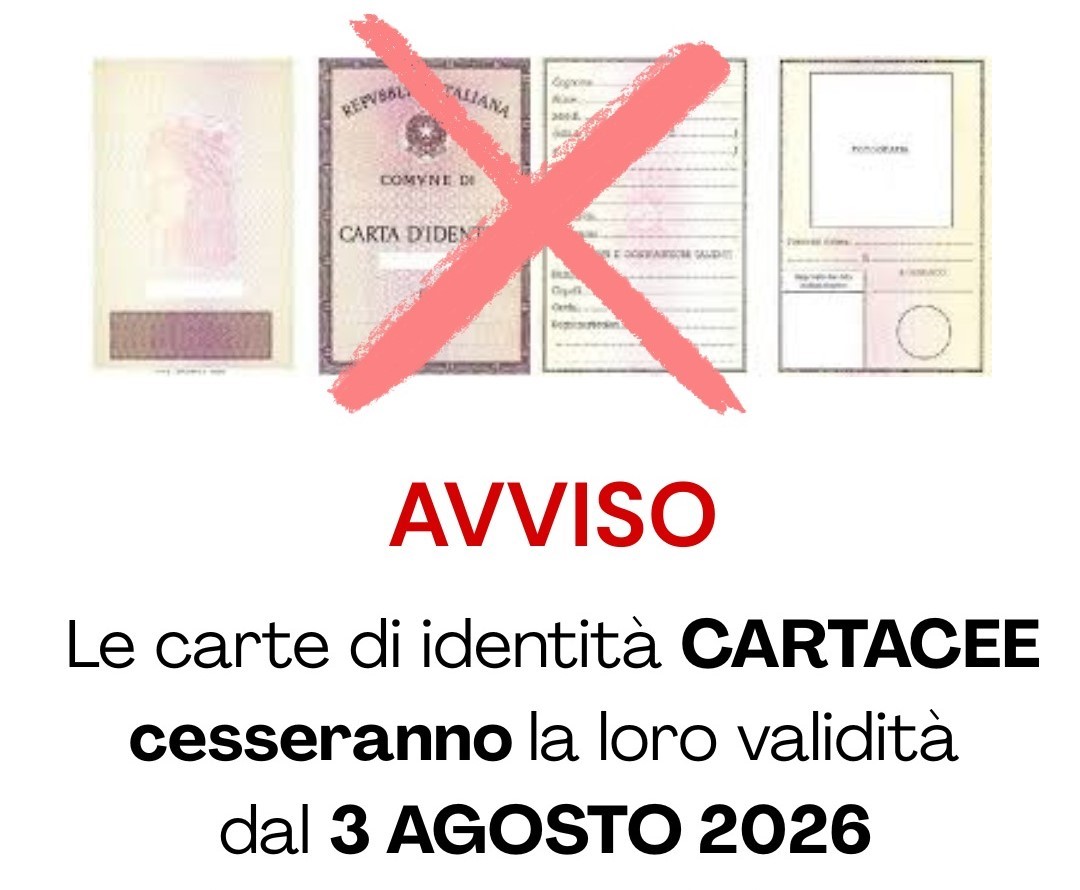Si invitano i/le cittadini/e in possesso della carta d’identità cartacea a controllare la scadenza riportata: nel caso la scadenza fosse successiva al 03 agosto 2026, sono invitati/e a prendere appuntamento per tempo all’Ufficio Anagrafe per il rilascio della nuova carta d’identità elettronica.