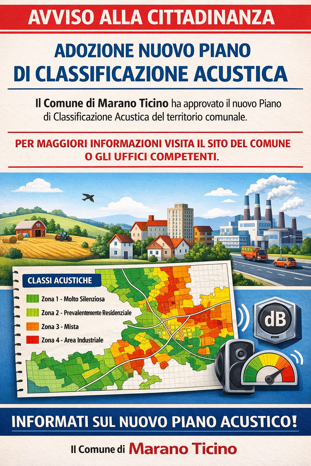 Con deliberazione di Consiglio Comunale n. 6 del 24/03/2026 è stato adottato il nuovo piano di zonizzazione acustica. Ogni soggetto interessato potrà presentare al Comune ed alla Provincia le proprie osservazioni in merito entro 120 giorni dalla data di pubblicazione del presente avviso