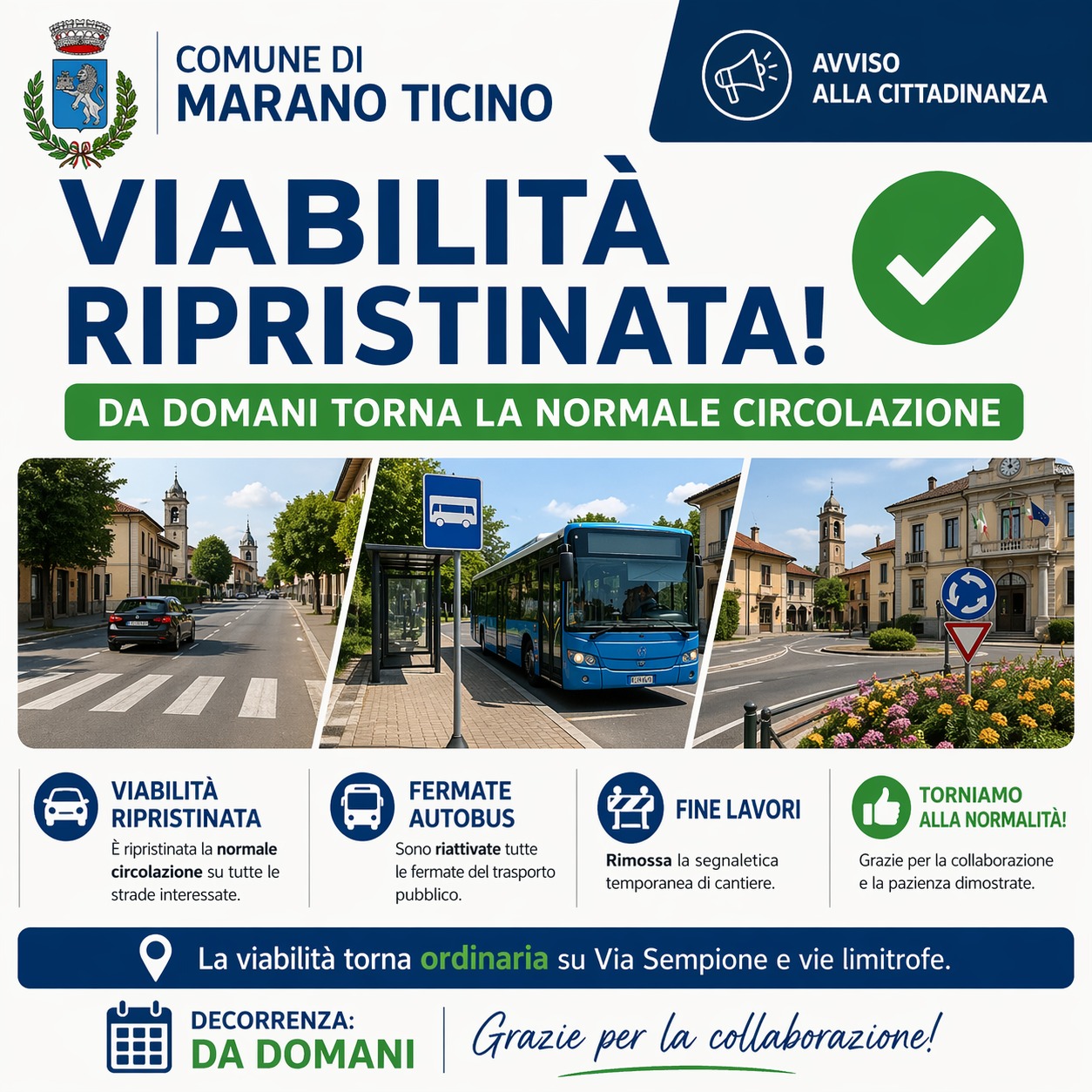 Si informano gli utenti interessati che da MERCOLEDI' 22 APRILE verrà ripristinata la normale circolazione di fronte al Municipio di Marano Ticino. Pertanto viene regolarmente ripristinata la fermata autobus posta in PIAZZA VITTORIO VENETO per tutti gli autobus che transitano in direzione Arona.